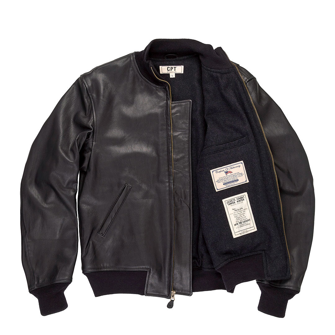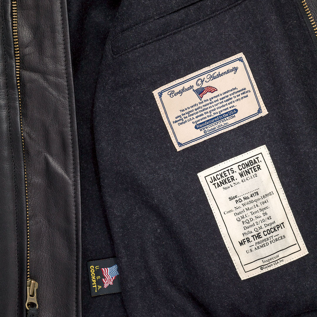 La giacca Tanker in cotone è stata introdotta per la prima volta nella seconda guerra mondiale esclusivamente per le unità corazzate in sostituzione dell'M41, che si era rivelato un indumento che forniva poco calore e difficoltà di manovra. Cockpit USA's Leather Tanker Jacket è realizzata con la pelle nera più liscia, con l'obbiettivo di portare questo stile a un livello superiore, utilizzando la pelle di capra scelta con perizia e mantenendo elementi originali come la fodera in lana e il collo e i polsini in maglia per un maggiore calore.