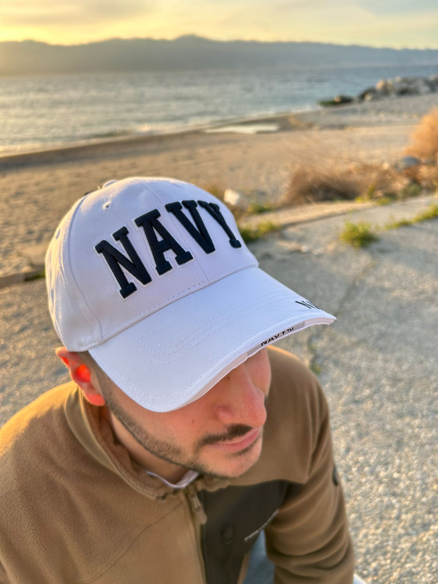 Testo "Navy" ricamato In Rilievo sia sul pannello frontale che sul bordo superiore
