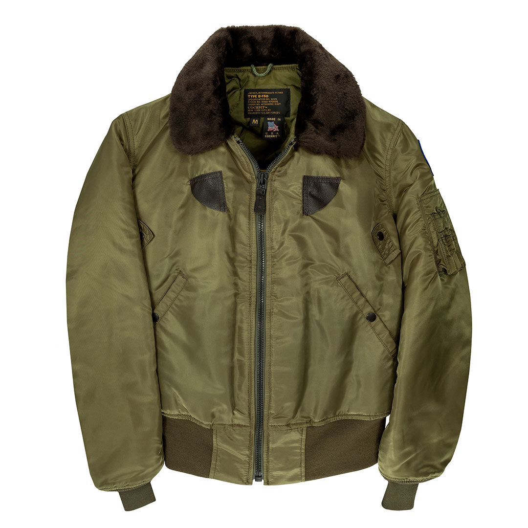 Questo Bomber fu utilizzato dai piloti dei bombardieri e dei cacciabombardieri americani durante la guerra di Corea 1950-1954. Questa Giacca in Nylon B-15 fu scelta per il calore e la facilità nei movimenti che garantiva. Il B-15 di Cockpit negli USA rimane fedele allo stile e agli ornamenti, tra cui tasche per penne con cerniera, colletto in pelliccia sintetica e tasche a taglio.